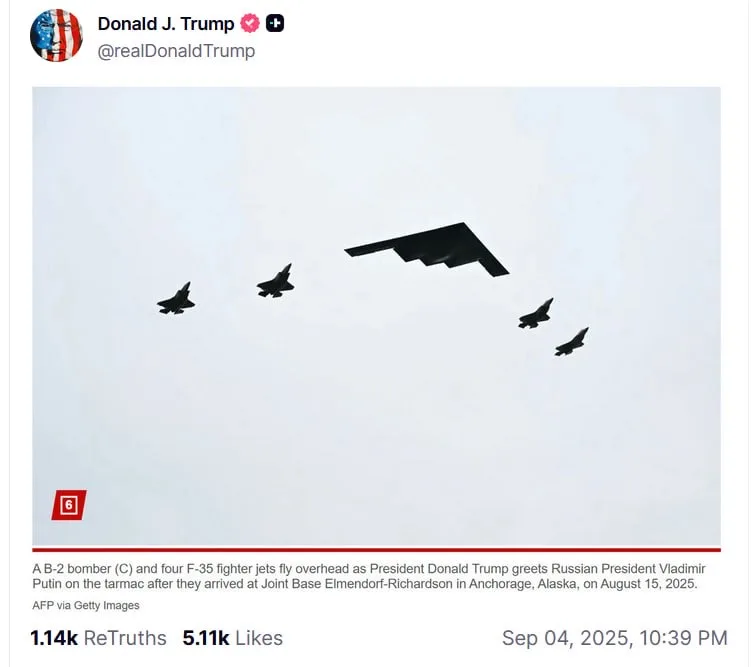 Президент США Дональд Трамп 4 сентября опубликовал в своей соцсети Truth Social совместное фото с Владимиром Путиным. Снимок был сделан во время их последней встречи на Аляске.