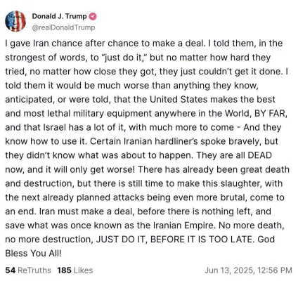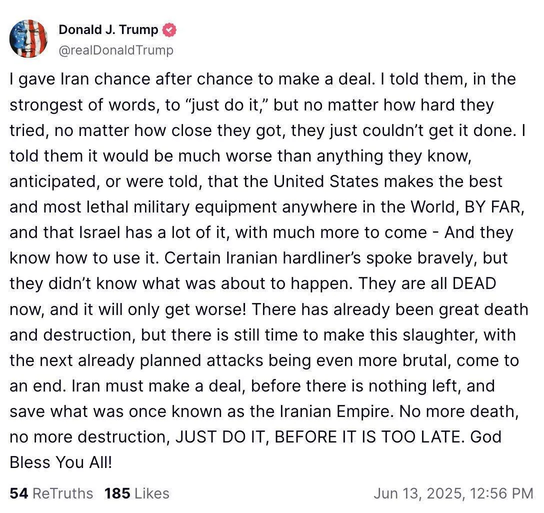 Я давал Ирану много шансов заключить сделку. Я настоятельно предупреждал их «просто сделать это», но они не справились. Я говорил, что это будет хуже, чем они ожидали.