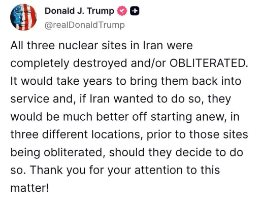 «Все три ядерных объекта в Иране были полностью разрушены и/или СТЁРТЫ с ЛИЦА Земли».
