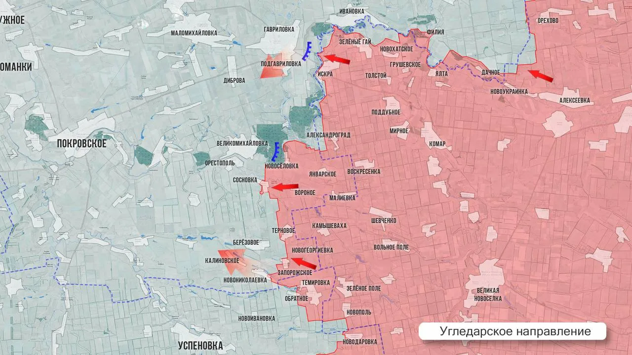 - На Покровском фронте на западном фланге продолжаются тяжёлые бои в районе Молодецкого, Удачного, Муравки. Севернее Мирнограда есть тактические успехи в районе Родинского. По сообщениям с мест, идут бои за Никаноровку, а в Новом Шахово удалось закрепиться на восточной окраине. В Золотом Колодезе упорные бои в центре села. Также была попытка контратаковать в районе Кучерова Яра.