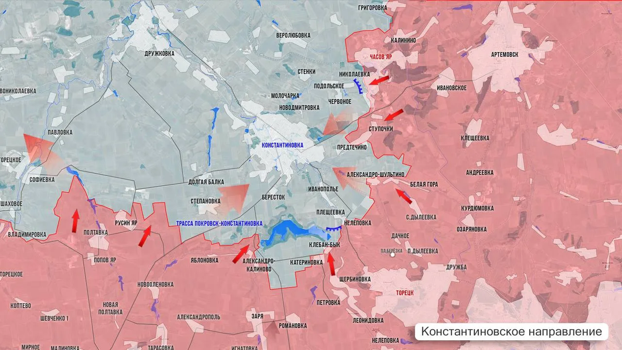 - На Константиновском отрезке севернее Яблоновки ВС РФ выбили противника из нескольких крупных опорников, расположенных вдоль дороги Мирноград-Константиновка. ВС РФ стараются закрепиться в южной части Плещеевки. К востоку от Константиновки, идёт зачистка кармана между Белой Горой и Ступочками. Южнее Предтечино наши войска смогли довольно значительно расширить подконтрольную территорию. Ещё выше по фронту наши одесантники бьют по позициям противника в Николаевке и в Червоном.