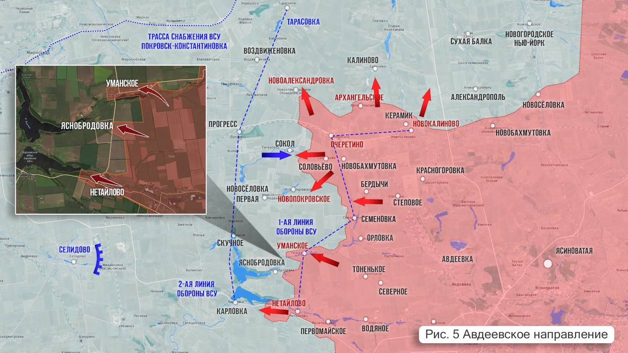 ▪️Ситуацию на Авдеевском фронте главком Сырский оценивает как «самую горячую». ВС РФ отбили контратаки ВСУ в Новопокровском, село фактически в наших руках, идет зачистка. Успех в этом селе сформирует полуохват с юга Новоселовки Первой и села Сокол, где тоже есть продвижение — армия России закрепилась на восточных окраинах и непрерывно теснит врага. Южнее наши продвинулись в сторону Карловки от Нетайлово, бои кипят. Пришло время штурма Яснобродовки: ВС РФ вышли в тыл гарнизону ВСУ, одновременно начав штурмы с восточной стороны. Ситуация для ВСУ близка к критической. У Новоалександровки наши атакуют в западном и северо-западном направлениях, растягивая редеющую линию обороны ВСУ. Севернее пока без перемен: в Калиново и Розовке ВСУ держат позиции, пока удары сконцентрированы на западнее.