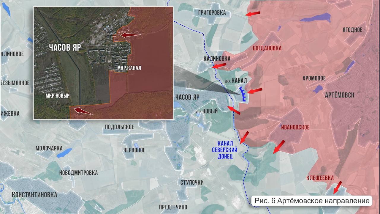 ▪️На Артемовском направлении ВСУ пытаются активно обороняться и сбить темп атак: контратакуют у Клещеевки и Калиновки, поддерживают оставшиеся в мкр Канал группы артиллерией. Большая часть мкр под контролем армии России, которая продавливает оборону, отрезает пути снабжения ВСУ. Продвижение дается очень тяжело.