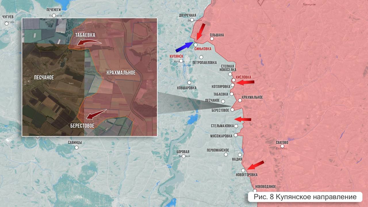 ▪️На Краснолиманском направлении бои в районе Тернов. На Купянском участке ВС РФ усиливают натиск на Стельмаховку, но пока ВСУ держатся. В районе Ивановки наши еще немного расширили зону контроля.