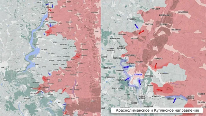 - С Краснолиманского направления сообщают о достаточно мощном продвижении ВС РФ в районе Святогорска. Наши войска закрепляются в Александровке и Сосновом, а также заходят на окраины Святогорска. Противник признаёт присутствие наших войск в районе Пришиба. На восточных окраинах Красного Лимана идут позиционные бои.
