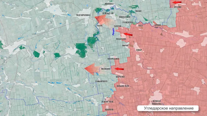 - На Угледарском направлении ВС РФ освободили Воскресенку, выйдя ещё на одном участке в Днепропетровскую обл. Это уже 6 населённый пункт, освобождённый в этом месяце. Южнее наши приблизились на 1,5 км к Александрограду, взяв под контроль единственную дорогу с твёрдым покрытием, ведущую в село. Идут бои на восточной окраине Малиевки. Севернее по фронту ВС РФ дожимают ВСУ в Новохатском и Зелёном Гае. По данным с мест, разрозненные группы ВСУ откатываются за реку Волчья в сторону Ивановки.