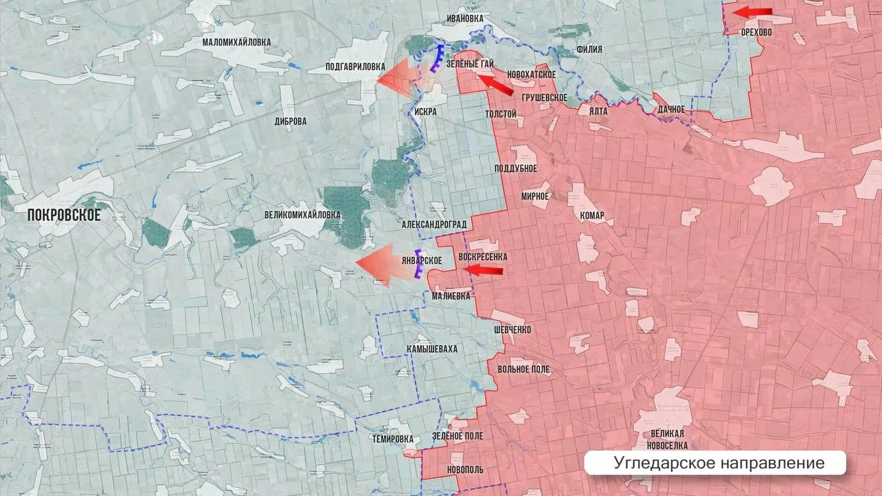 ▪️На западном участке Покровского направления армия России атакует вдоль лесополос в направлении границы с Днепропетровской обл. На юге от Покровска российская пехота, несмотря на ожесточённое сопротивление ВСУ, продвинулась далеко за Троянду и ведёт бои в районе Шахтёрского, чтобы выровнять линию фронта и выйти на железнодорожную ветку. Противник отступает из соседнего Чунишино. Вооружённые силы России отрезали восточный путь снабжения Покровска, продвигаясь в районе Миролюбовки. Наступая в районе Сухецкого, что на севере от Родинского, наши войска лишили противника и важнейшего северного маршрута снабжения Покровска. При этом потеря самого Родинского ускорит обрушение всего северного участка обороны Красноармейской агломерации.