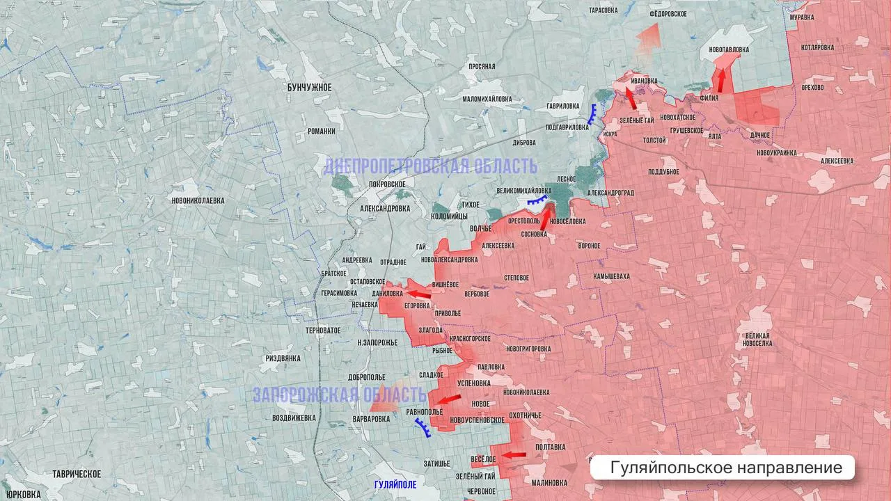 - На Гуляйпольском направлении 9 км вдоль реки Янчур на стыке Запорожской и Днепропетровской обл контролируются армией России. Наши бойцы сегодня освободили Новое Запорожье, тем самым установили контроль над крупным узлом обороны ВСУ площадью более 14 км² и продолжили продвигаться в междуречье. Есть успехи в районе Отрадного и Тихого. На севере направления увеличили зону контроля в Новопавловке.