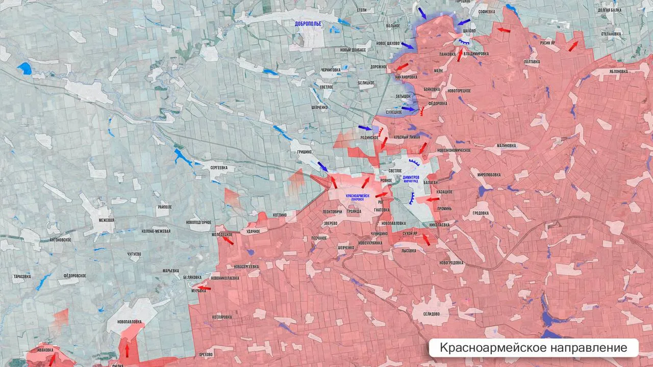 - Завершается зачистка Красноармейска. На западе от города ВС РФ заняли шахтоуправление «Покровское». Из района Котлино наши пробиваются к Сергеевке. На севере от Красноармейска идут бои у дороги из Родинского в Гришино, а также в направлении самого Гришино. На востоке от города – ожесточённое сражение за Ровное, юго-восточнее наши продвинулись вдоль дороги и заняли постройки южнее Светлого. ВС РФ зашли на западные окраины Димитрова, на который теперь давят с четырёх сторон. Одна из бригад ВСУ, заблокированная в Димитрове, сегодня запросила коридор для выхода из города. Отдельные группы ВСУ засели и лесах между Проминем и Казацким, а также в опорном пункте западнее Новоэкономического. ВС РФ продвигаются широким фронтом в районе Софиевки и Шахово.