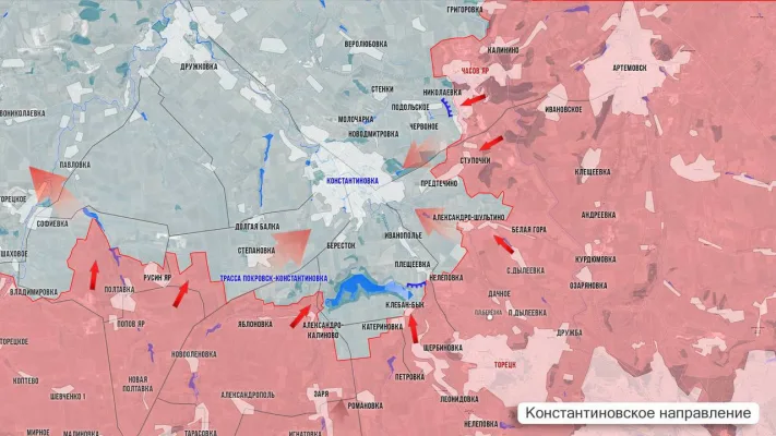 - На Константиновском направлении идут тяжёлые бои в районе Клебан-Быка и Катериновки. ВС РФ постепенно теснят врага в южной части Плещеевки. Есть успехи севернее Александро-Шультино. С мест сообщают о продвижении наших в районе Предтечино. Западнее Часов Яра упорное сражение.