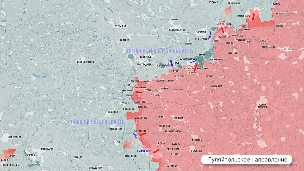 - В Гуляйполе ВС РФ продвигаются. Наши бойцы рассекретили информацию о захвате КП противника с техникой, документами и картами. Рубежи противника сокращаются в западной части города, а единственная дорога находится под плотным огневым контролем. МО РФ сообщило об освобождении Косовцево, фактически это означает начало боёв за Терноватое. Наши части взяли за день под контроль 23 кв. км. территории. Севернее посёлка ВС РФ выходят на подступы к Христофоровке и готовятся начать штурм Терноватого с севера.