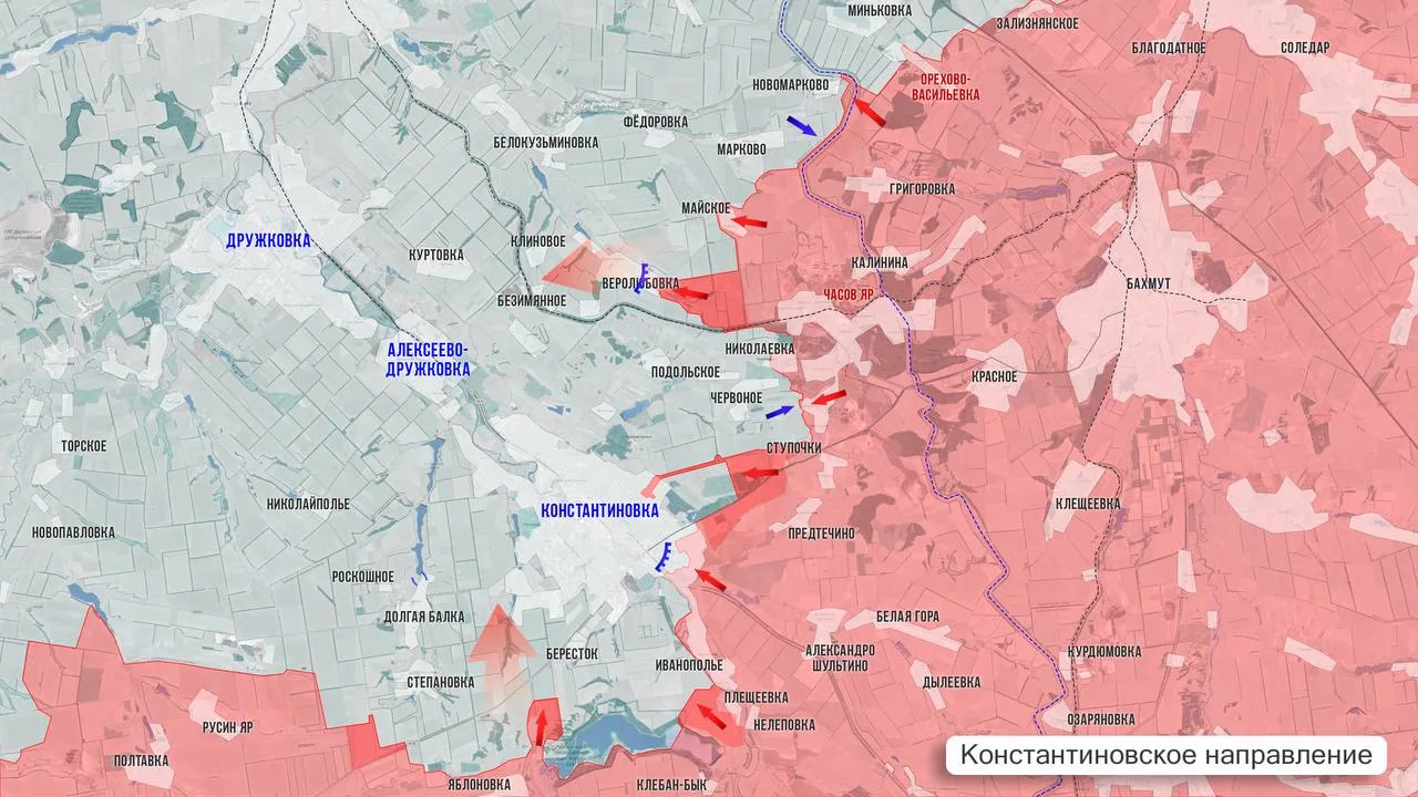 - На Константиновском направлении ВС РФ вышли к Степановке с юга и стараются зацепиться за село. В Константиновке наши бойцы углубляются в центр города. Сообщают, что Новомарково практически перешло под наш контроль. Есть успехи в районе Миньковки. От этого села меньше 7 км до выхода в тыл гарнизону ВСУ в Рай-Александровке.