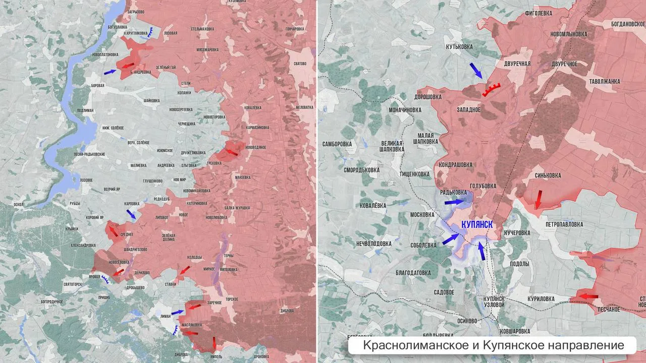 - На Купянском фронте ситуация складывается примерно следующая: резервы ВСУ пока не заканчиваются, атаки со стороны Соболевки и Московки идут практически непрерывно, ДРГ заходят в город и пытаются закрепиться. Ситуацию для ВС РФ осложняет то, что враг закрепился на территории консервного комбината и блокирует снабжение наших войск в западной части Купянска. Также противник наращивает боевую активность на восточном берегу со стороны Купянска-Узлового. Наши дроны и авиация практически непрерывно уничтожают технику врага, склады с боеприпасами и живую силу. Появляются данные, что враг использует боеприпасы с отравляющими веществами.