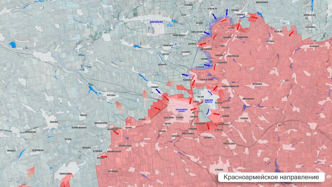 - На Красноармейском направлении, по данным с мест, завершена зачистка Красноармейска. В Димитрове окружены несколько батальонов ВСУ, для которых нет путей отхода. МО РФ объявило об освобождении села Ровное, расположенном на трассе между Красноармейском и Димитровым. На северо-западе от Красноармейска идёт зачистка Гришино. На северо-востоке – есть тактические успехи по рубежу Суворово-Никаноровка. Увеличена зона контроля на севере от Русин Яра.