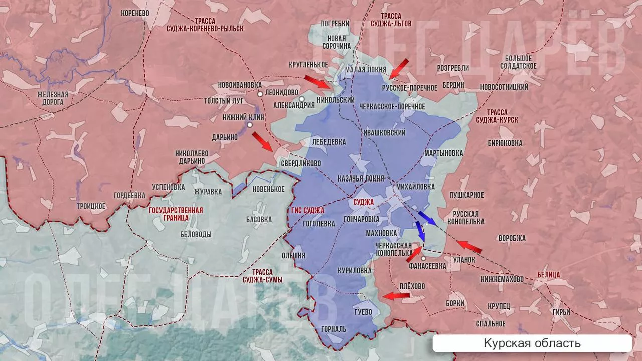 - Российская армия продавливает оборону противника южнее Свердликово и Николаево-Дарьино, через госграницу по направлению к Новенькому. По неподтвержденным данным, нашим частям уже удалось зайти на окраину деревни. Атаку российских десантников активно поддерживает наша авиация. Но и ВСУ обороняет здесь каждый опорный пункт, стягивает силы на северной границе Басовки. Бои идут серьезные, так как потеря Новенького и Басовки означало бы для ВСУ утрату главной трассы снабжения Суджанской группировки.