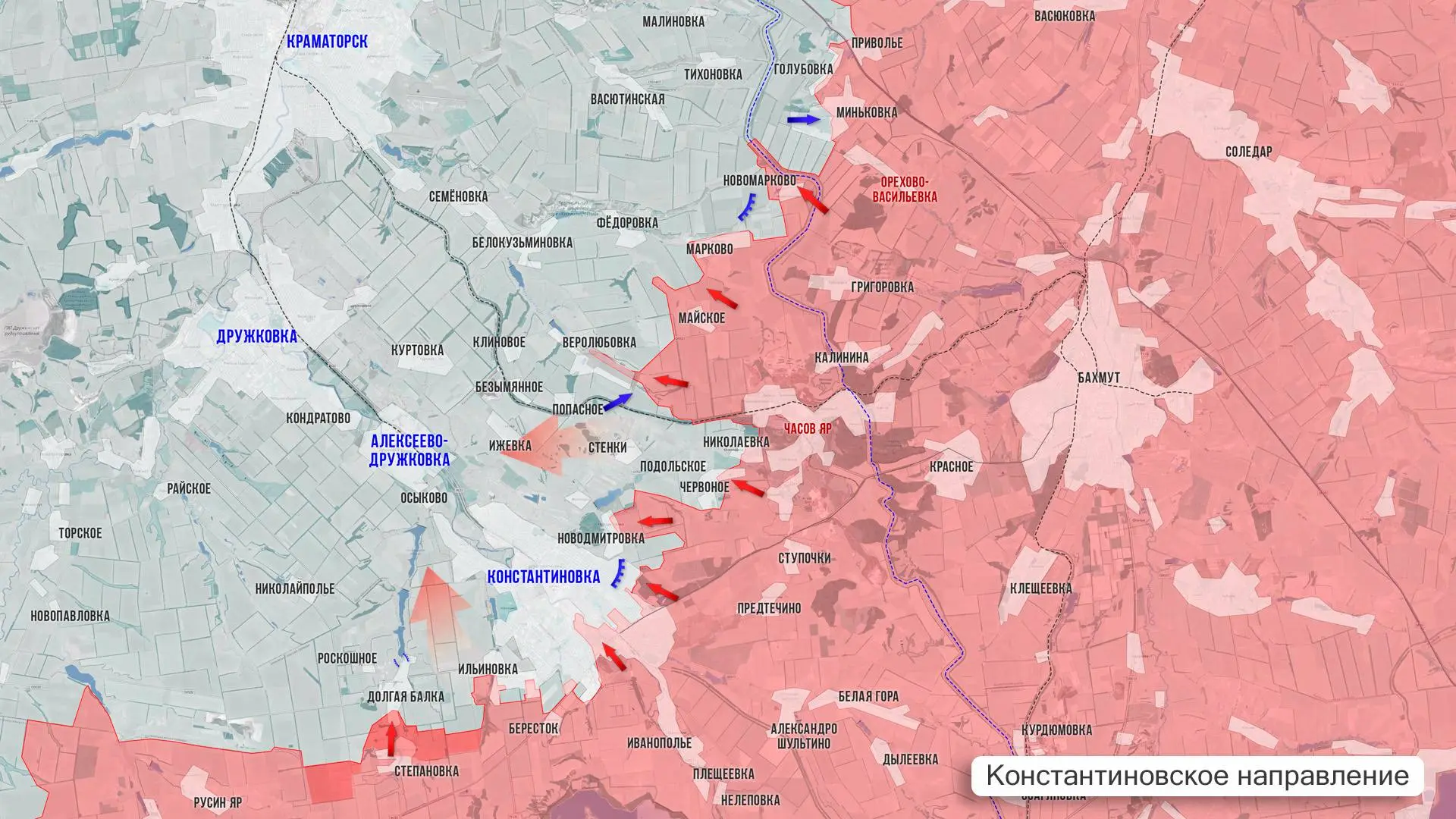 - На Константиновском участке интенсивное сражение в сёлах к юго-западу от города – в Долгой Балке и Ильиновке. ВСУ ожесточённо бьются, а на территории Константиновки дронами пытаются замедлить продвижение наших войск. ВС РФ, в свою очередь, методично бьют по логистике противника и ПВД в городской черте. В районе Часов Яра ситуация стабильно тяжёлая, без изменений.