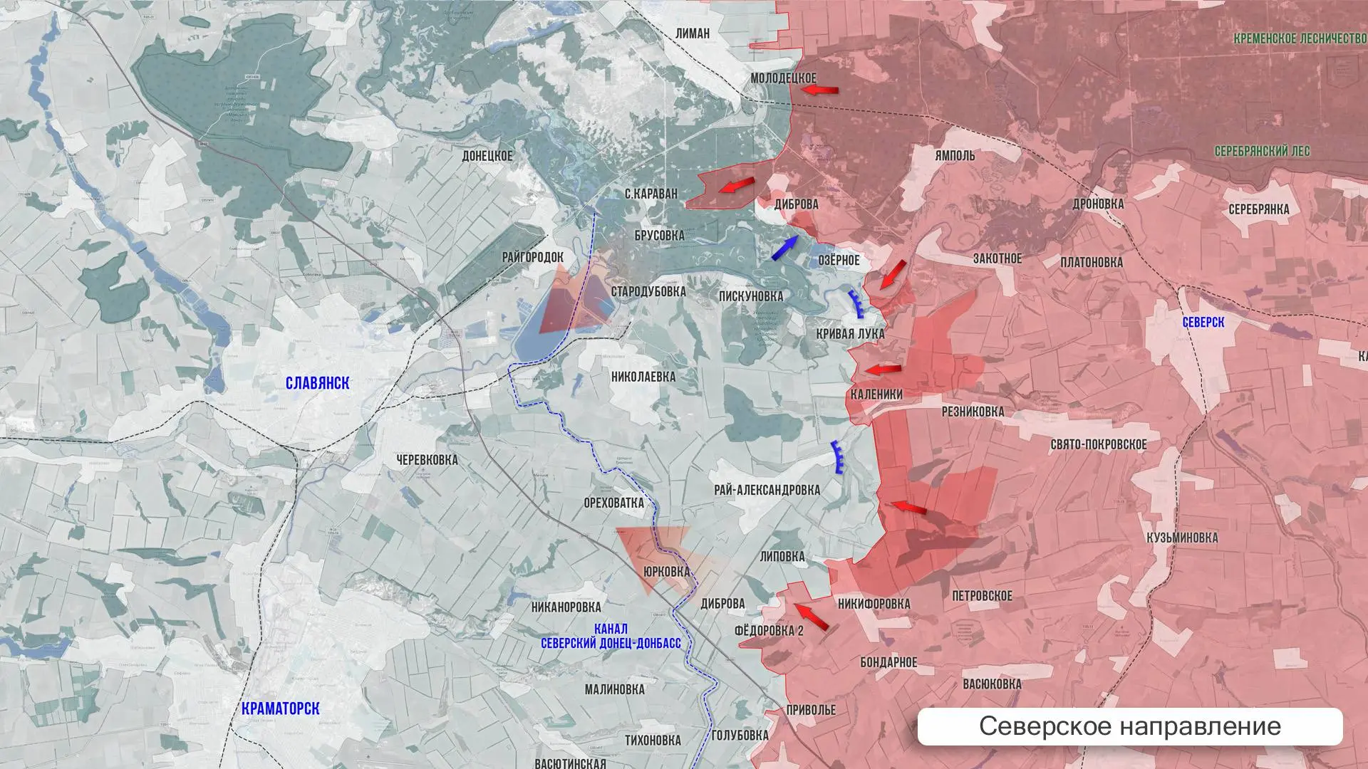 - На Северском направлении не стихают бои в районе Дибровы, Фёдоровки Второй и Никифоровки. ВСУ продолжают яростно контратаковать, удерживая южные рубежи Рай-Александровки. ВС РФ зачистили большой «карман» к северо-востоку от Каленков и выровняли фронт по линии Каленики – Кривая Лука.