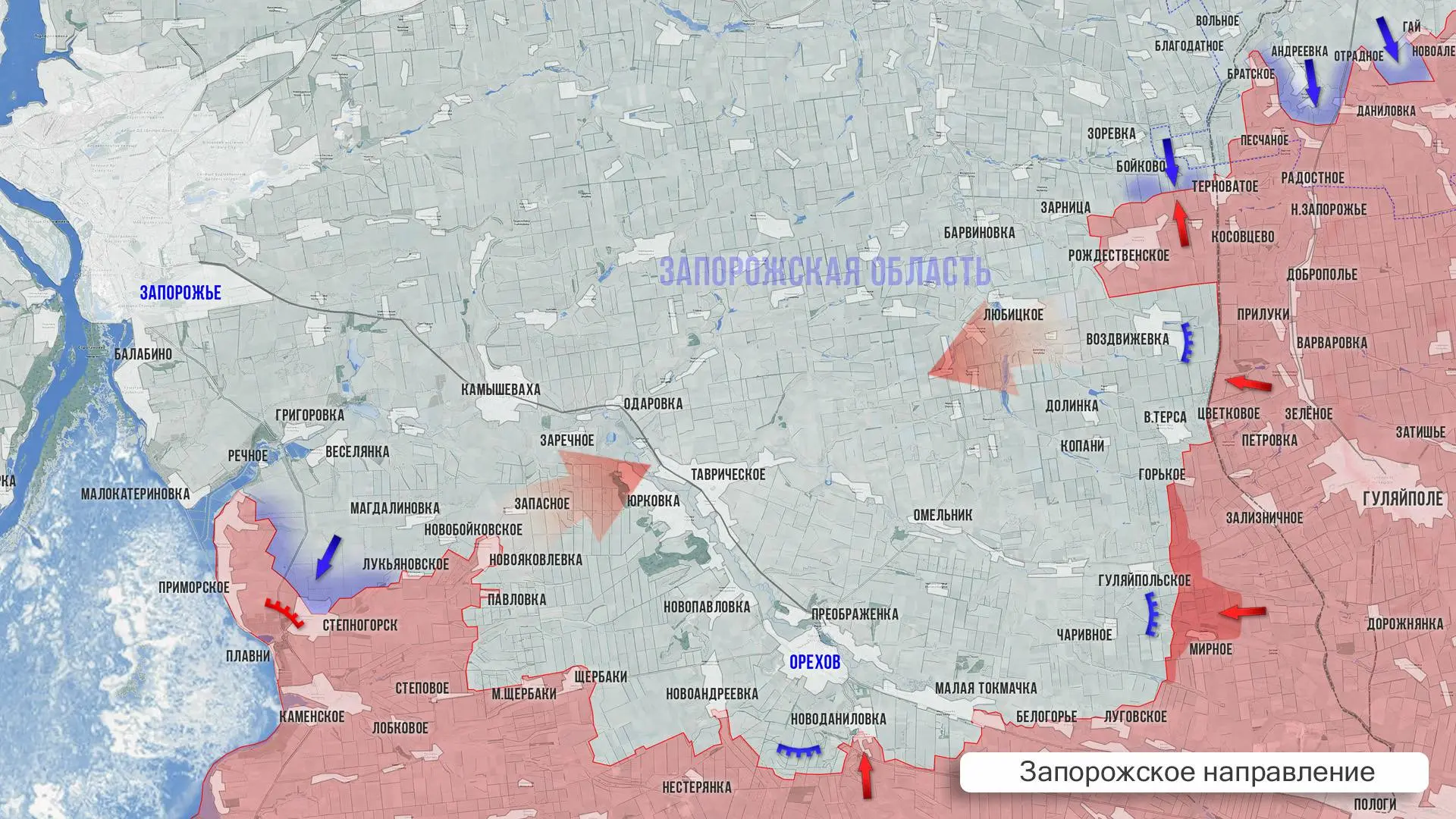 - С Днепровского направления приходят противоречивые данные о клине, который ВСУ стремятся вбить в российские позиции на юге от Орестополя. По одним данным, нижняя граница кармана ВСУ проходит по рубежу Калиновское и Берёзвое, по другим эти сёла и Степовое контролируются нашими войсками. В любом случае закрыть этот карман наши войска смогут, продолжая наступать на Лесное и установив контроль над Великомихайловкой. Выше по фронту ВС РФ зачистили участок шириной в 4 км севернее Ивановки, вернули утраченные позиции в Новопавловке.