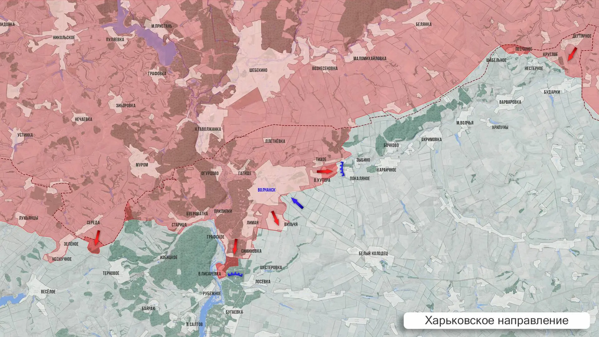 - На Харьковском направлении ВС РФ развивают наступление к Бугаевке и Лосевке, а также на севре от Шестеровки. Складывается критическая для ВСУ ситуация на участке от Покаляного до Охримовки. Форсировав реку, наши бойцы потеснили противника в Охримовке и вышли к южной окраине села и дороге Волчанск – Землянки. Чтобы не дать ВС РФ спуститься на юг вдоль р. Плотва и выйти в тыл группировки ВСУ в Ольховатке, противник ожесточённо контрактует со стороны Захаровки. В свою очередь наши накатывают на Ольховатку с востока из района Шевяковка-Чугуновка.