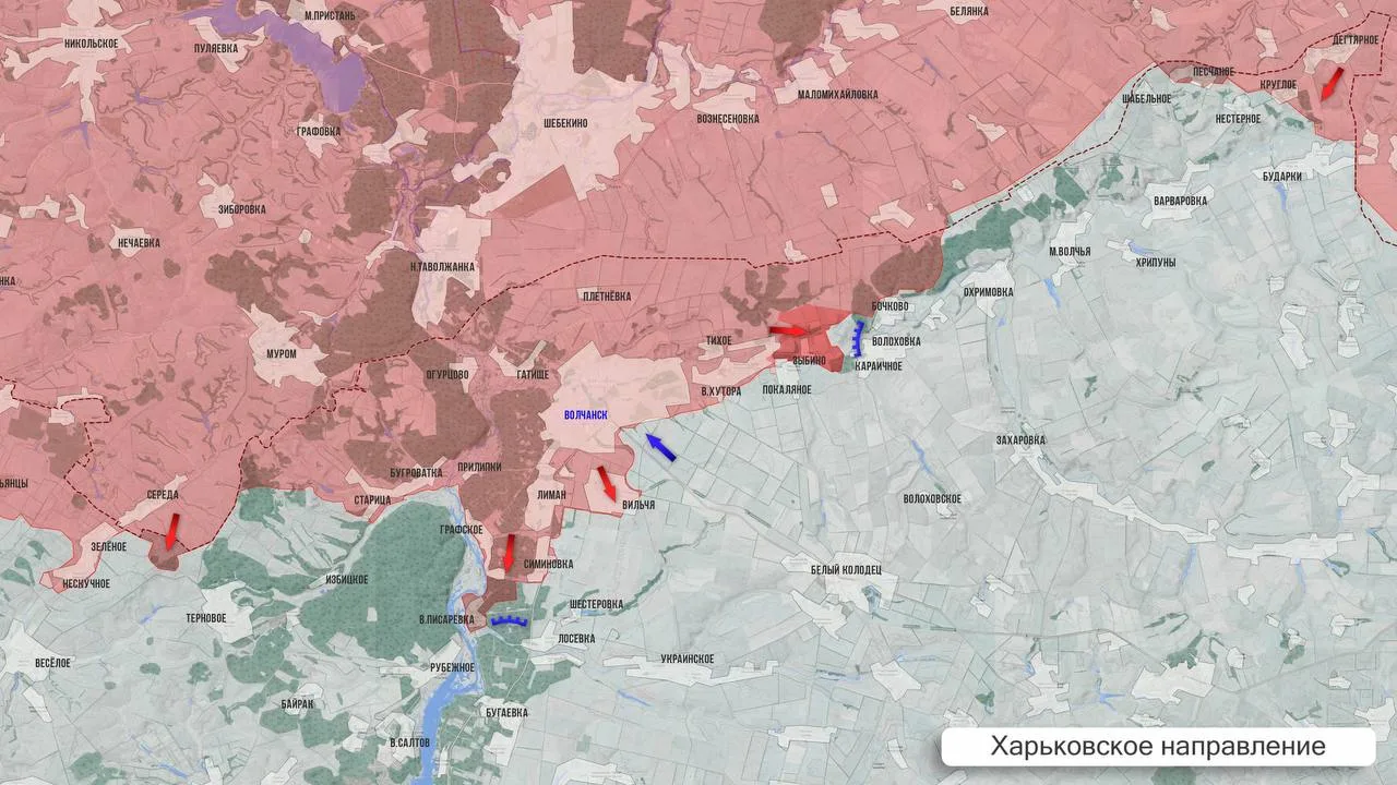 - На Харьковском фронте МО РФ сообщило об освобождении с. Землянки, в 30 км восточнее Волчанских Хуторов. ВС РФ выстраивают буферную зону вдоль р. Волчья. Бои идут на окраинах Покаляного, а также на подступах к с. Караичное, откуда противник огрызается контратаками. Наши войска стараются закрепиться на окраинах Охримовки.