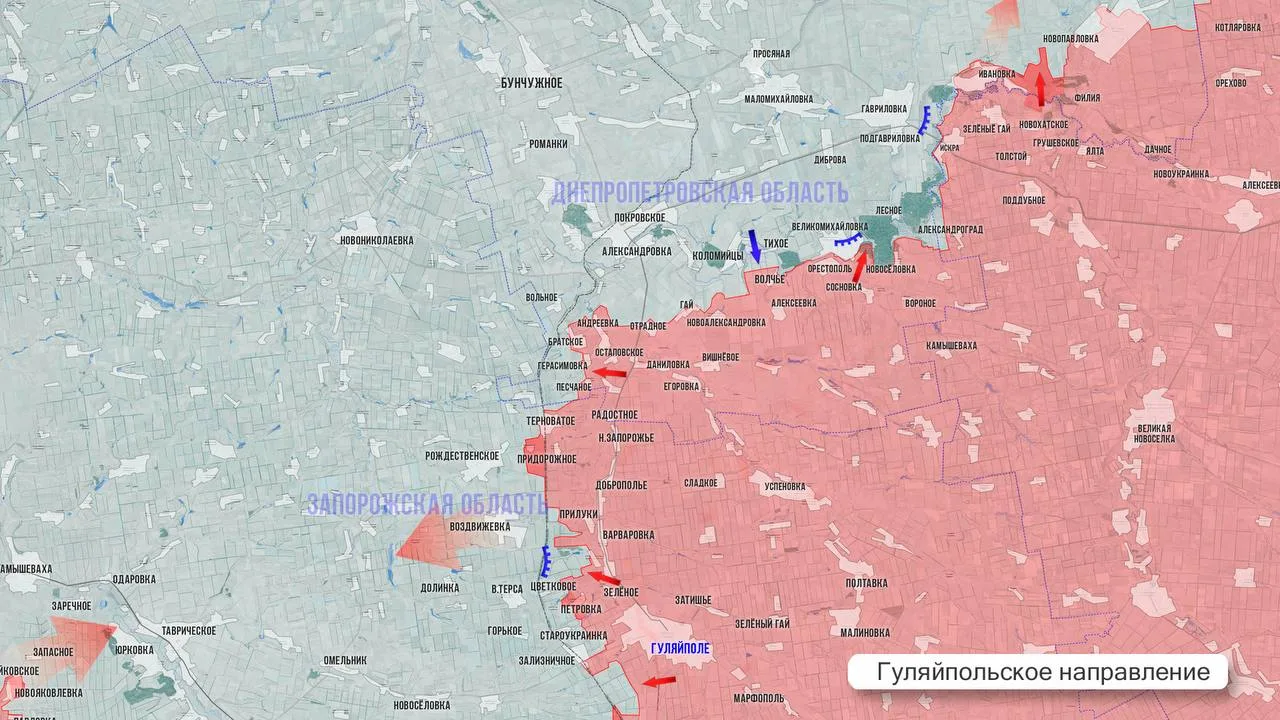 - На Гуляйпольском направлении со стороны Староукраинки ВС РФ выбили врага из опорников западнее Зализничного и выходят на подступы к Горькому. В Зализничном идут интенсивные городские бои, враг удерживается в западной части посёлка, но инициатива находится в руках наших военных. Южнее есть продвижение в сторону Гуляйпольского. Продолжаются бои за Криничное и на подступах к Цветковому. Дроны и артиллерия бьют по позициям и опорникам ВСУ в районе Верхней Терсы, Рождественского, Любицкого и Воздвижевки. Тем временем у противника распространяют информацию о якобы мощном продвижении ВСУ в тыл нашей армии. По версии этих источников, ВСУ дошли практически до села Калиновское, что в 25 км к востоку от Терноватого и примерно в 20 км от русла реки Гайчур. С нашей стороны эта информация никак не комментируется.