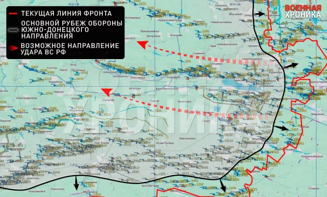 Во-первых, все основные узлы обороны здесь развёрнуты… на юг. То есть удара, надо полагать, ожидали оттуда, куда планировали выйти в ходе прошлогоднего наступления. Во-вторых, если хотя бы частично удар российской армии будет нанесён так, как на карте показывают красные стрелки, то появится возможность скатать в рулон весь участок фронта от южно-донецкого направления и практически до Днепра.