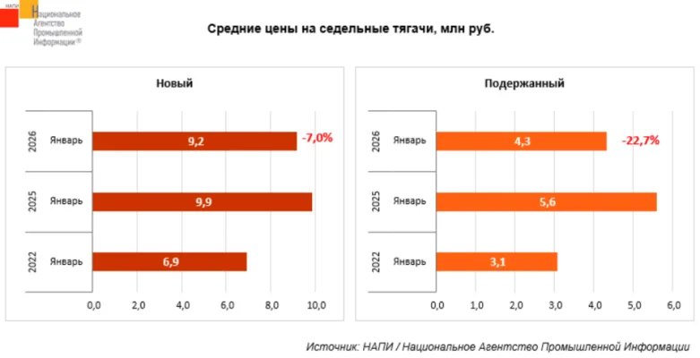 В начале 2026 года рынок седельных тягачей в России преподнес неожиданный сюрприз: стоимость как новых, так и подержанных машин заметно снизилась. По данным маркетингового агентства НАПИ, средняя цена нового тягача в январе составила 9,2 миллиона рублей, что на 7% меньше по сравнению с концом прошлого года. Однако еще более впечатляющее падение зафиксировано на вторичном рынке — здесь средняя стоимость опустилась до 4,3 миллиона рублей, что означает снижение сразу на 22,7%.