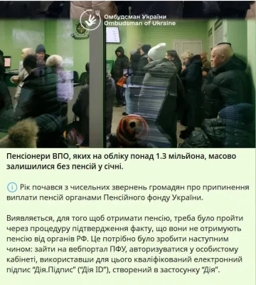 В январе сразу 1,3 млн украинских пенсионеров, из числа внутренне перемещённых лиц, остались без выплат из-за бюрократического цифрового квеста. Чтобы получить деньги, от них потребовали оформить электронную подпись через приложение «Дия», в котором большинство пожилых людей просто не умеют пользоваться.