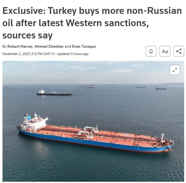 По данным агентства, один из крупнейших турецких НПЗ — SOCAR Turkey Aegean Refinery, принадлежащий азербайджанской компании SOCAR, недавно приобрёл четыре партии нефти с поставкой в декабре не у России.