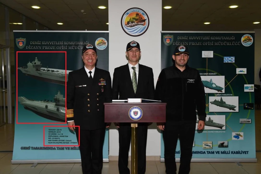 Состоявшийся недавно визит президента Реджепа Эрдогана в проектно-конструкторское бюро ВМС Турции, по сообщению местного Министерства обороны, имел целью ознакомление с ходом работ по проекту отечественного авианосца. После этого визита была обнародована (и вряд ли случайно) фотография, сделанная на фоне плаката с «картинками» и основными характеристиками перспективного турецкого АВ.