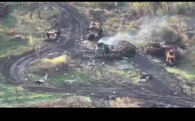 На видео картина разгрома — остовы бронетехники и горящие «коробки» противника, более 25 единиц тяжелой техники на маленьком участке дороги на Димитров (Мирноград)