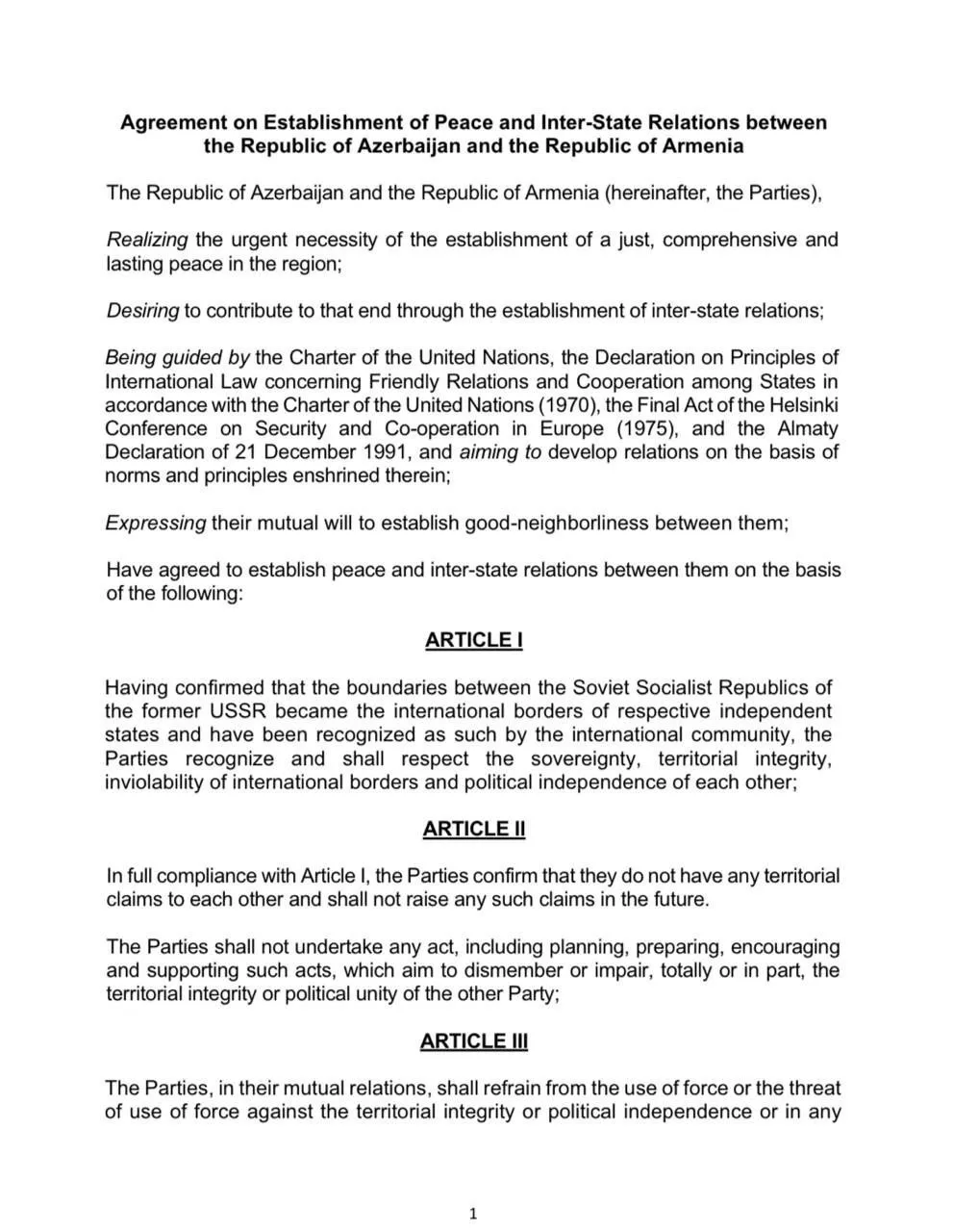 По мирному договору, стороны: признают необходимость восстановить дипломатические отношения, отказываются от территориальных претензий и направленных на «расчленение или ослабление друг друга» действий, воздерживаются от угрозы применения силы, договариваются о делимитации границы и оставляют возможность заключать соглашения в области экономики и культуры.