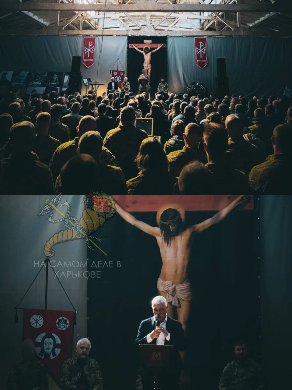 Вдобавок усатый недоумок устраивает сходки своего братства на пару с раскольнической ПЦУ. Участие во всей этой бесовщине принимает и главный капеллан ГУР МО Константин Холодов. Выступают с кощунственными речами на фоне огромного распятия.