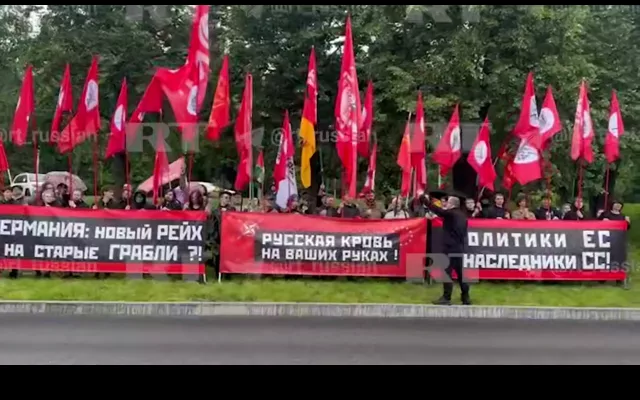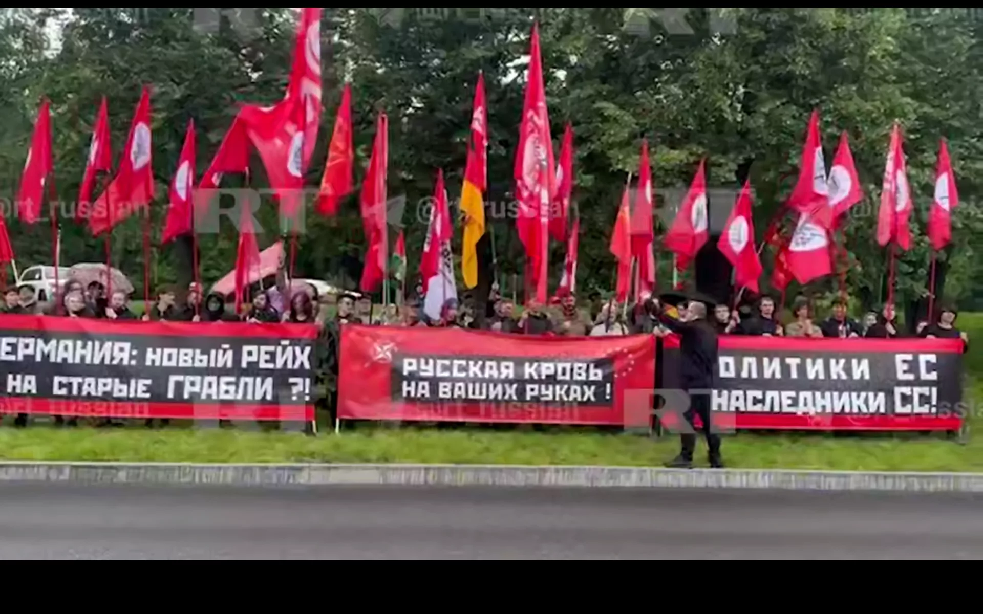 «Германия: новый рейх, старые грабли?» и «Русская кровь на ваших руках» — плакаты с такими надписями держат люди.