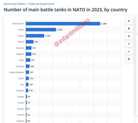 Учитывая количество танков, принадлежащих членам НАТО, у Турции почти столько же танков, сколько у всех членов НАТО, кроме США, вместе взятых. Количество танков, которые есть у Турции и Греции, вдвое меньше, чем у США.
