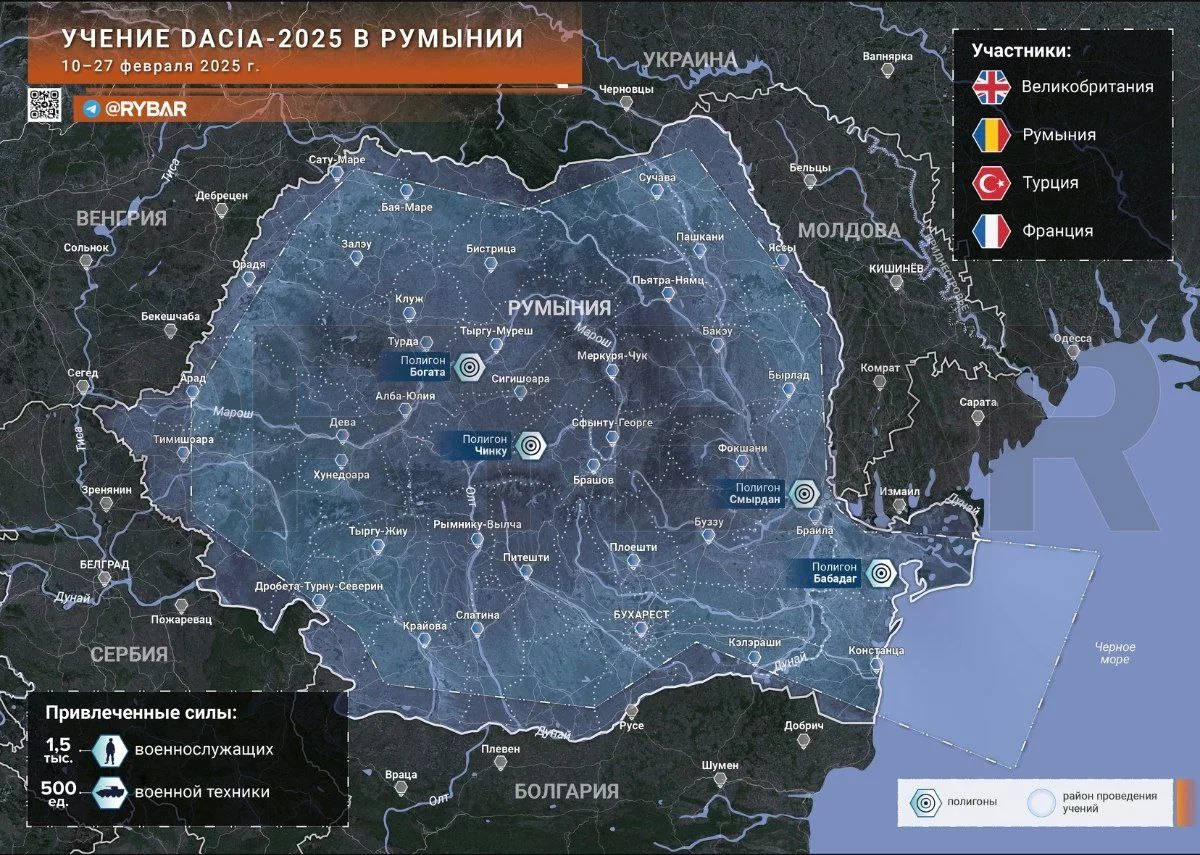В одно время с масштабным учением НАТО Steadfast Dart в Румынии, Болгарии и Греции проходило еще одно учение, которое идет и сейчас. С 10 по 27 февраля на румынской территории проходит мероприятие Dacia-2025.