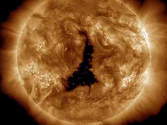 В короне Солнца образовалась значительная дыра, форма которой напоминает цифру один и достигает высоты 1 миллиона километров.