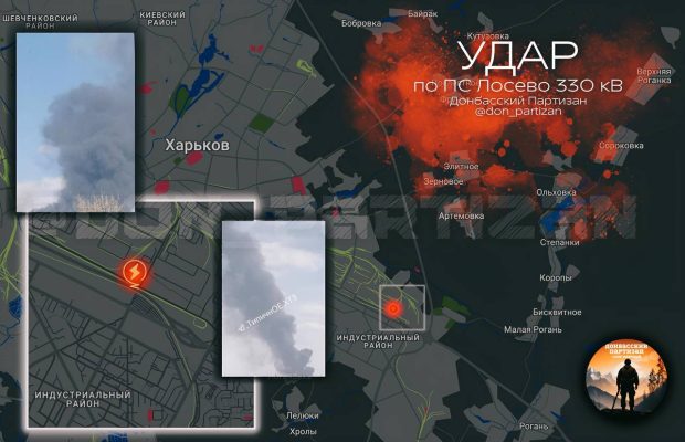 Сегодня днем российскими войсками нанесен удар по ПС Лосево 330 кВ в Индустриальном районе Харькова.
