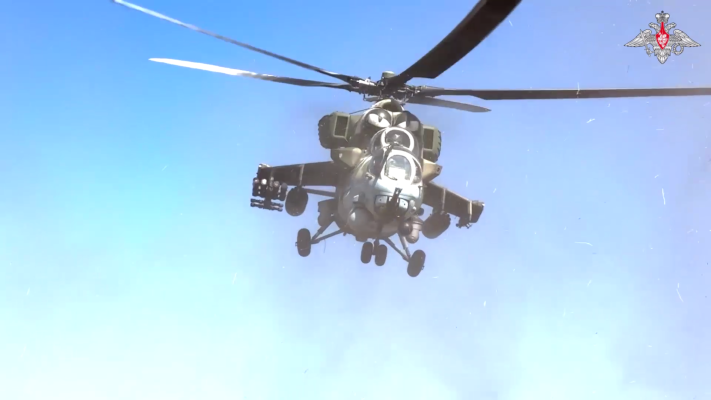 Экипаж армейской авиации на вертолете Ми-35м нанес удар авиационными средствами поражения по замаскированной бронированной технике подразделений ВСУ в приграничном районе Курской области.