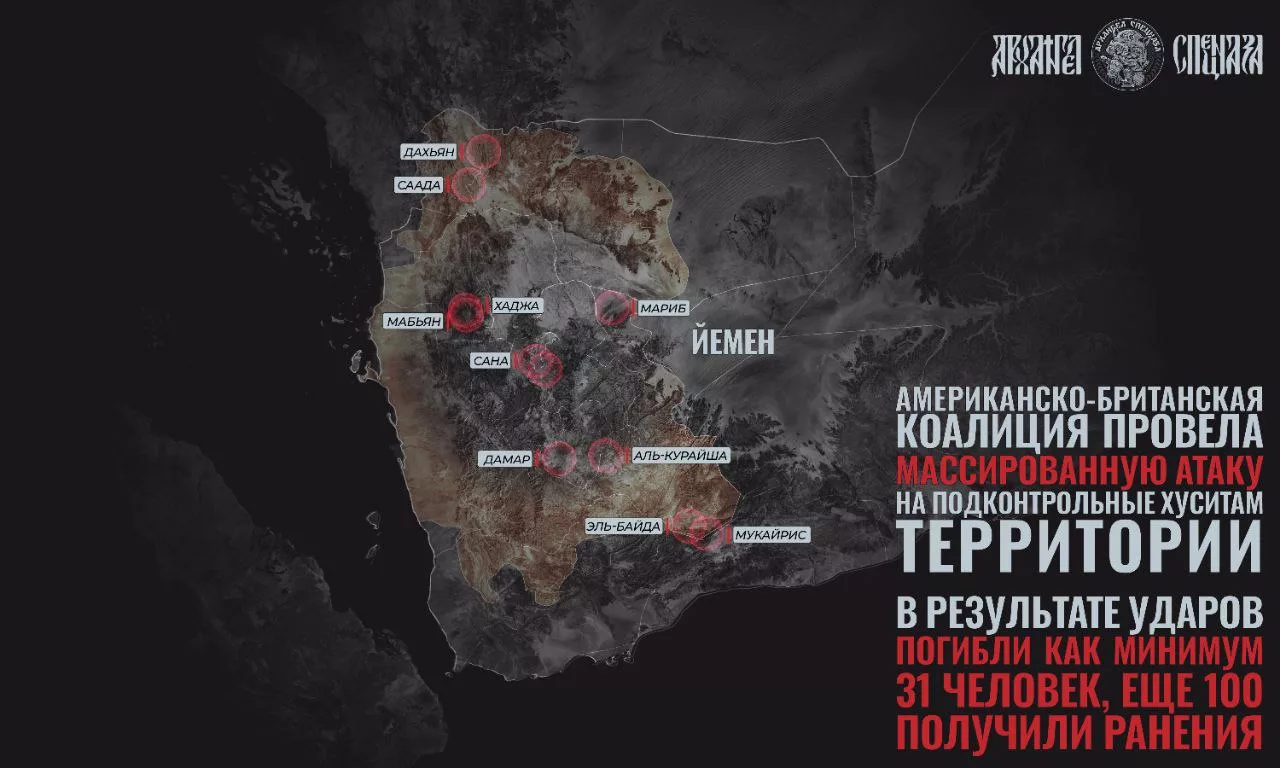 Итак, американцы провели массированный удар по Йемену. Было поражено не менее 11 населенных пунктов. Наибольшим ударам подверглась столица Сана, где отмечены прилеты в пяти кварталах и одном пригороде.