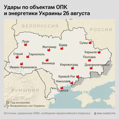 26 августа на Украине с шести часов утра по московскому времени началась воздушная тревога, за которой последовали мощные удары по объектам оборонно-промышленного комплекса и энергетики.
