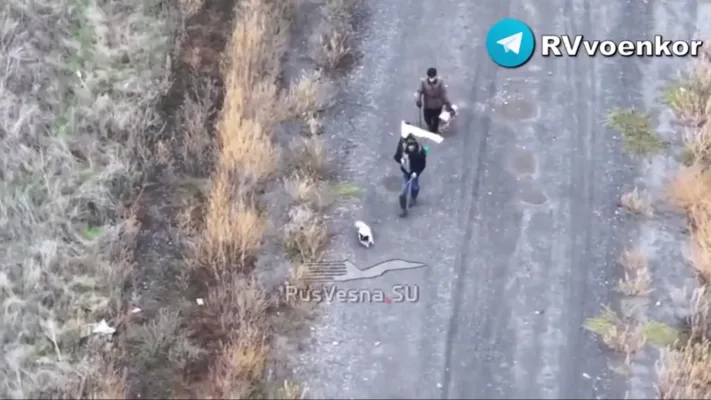 На одном из видео видно, как FPV-дрон сначала долго и пристально осматривает одного из мужчин с белым флагом и собачкой, после чего все равно наносит удар. Затем другой дрон убивает шедшего следом дедушку, который, как видно на другом видео, долго молится перед смертью.