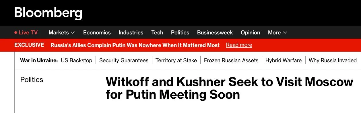 Спецпосланник Трампа и его зять планируют в январе поехать в Москву для переговоров с Путиным, сообщает Bloomberg.