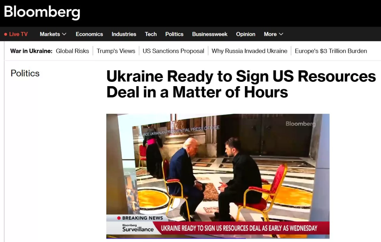 Киев готов в обмен на поддержку Вашингтона за считаные часы подписать с США соглашение о доступе к украинским природным богатствам — от нефти и газа до редкоземельных минералов, — пишет Bloomberg.