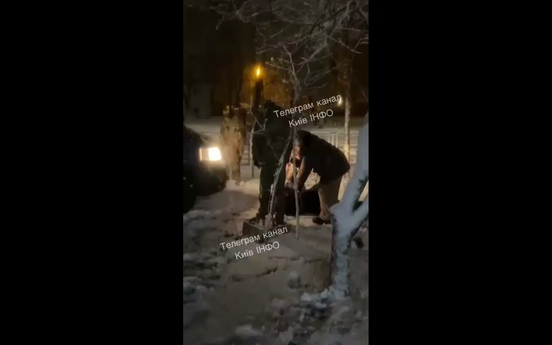 Киев. Мужчину тащут по снегу, как барана на заклание. Комментатор за кадром утверждает, что военкомовские применяют электрошокеры и газовые балончики. На последних кадрах видео людолов «задувает» женищину-оператора зарядом «перцовки».