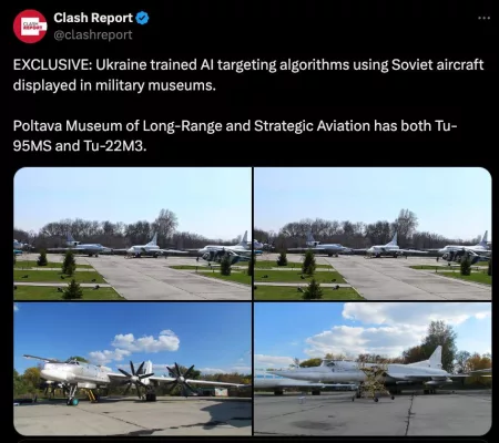 - По информации издания, в Полтавском музее дальней и стратегической авиации были использованы самолёты Ту-95МС и Ту-22М3. Именно на них проводилась «тренировка» систем искусственного интеллекта, установленных на дронах.