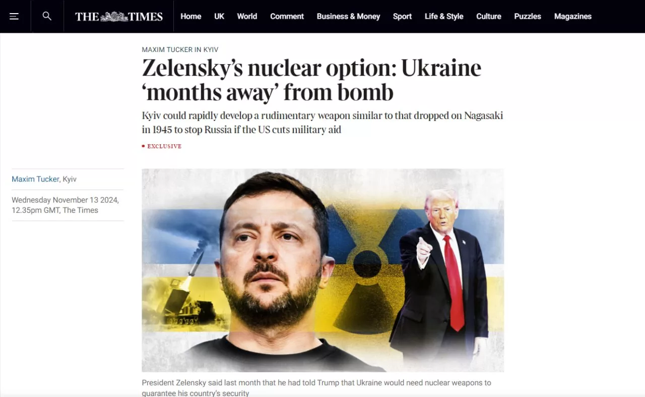 Издание The Times со ссылкой на некий доклад Минобороны Украины пишет, что страна якобы может разработать примитивную ядерную бомбу в течение нескольких месяцев, если Дональд Трамп прекратит военную помощь для ВСУ.
