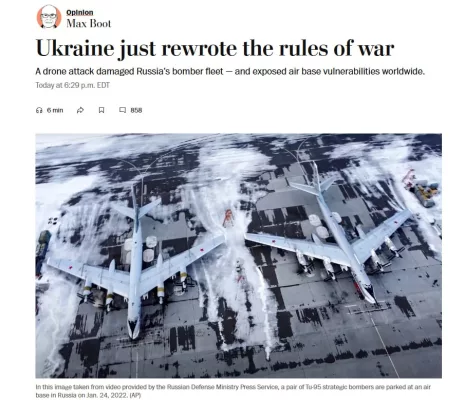 Эксперты утверждают, что это может стать началом конца эры пилотируемой авиации. Рой украинских дронов, стоивших десятки тысяч долларов, вывел из строя российские боевые самолёты на сумму около 2 млрд долларов.