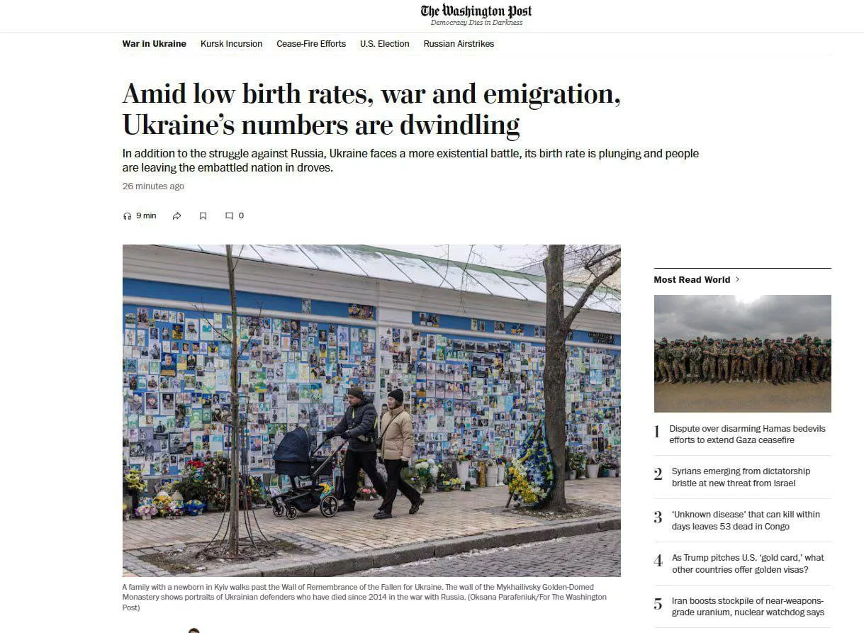 По данным издания, около 5 миллионов человек покинули Украину, еще столько же сейчас проживают на территориях, находящихся под контролем России. При этом уровень смертности в стране значительно превышает рождаемость — смертей фиксируется почти в три раза больше, чем рождений.