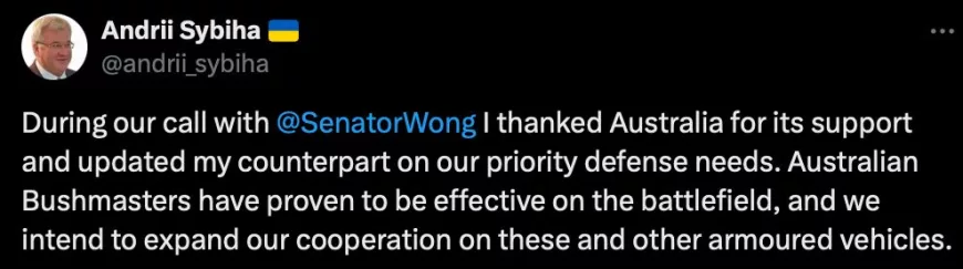 Министр иностранных дел Украины Андрей Сибига сообщил в социальной сети Х о намерении Киева расширить взаимодействие с Австралией в области поставок военной техники. В частности, Украина выразила интерес к приобретению списанных бронетранспортёров Bushmasters и других бронированных машин из Австралии.
